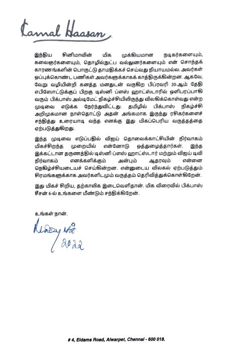 பிக்பாஸ் நிகழ்ச்சியில் இருந்து விலகினார் நடிகர் கமல்ஹாசன்! Cinema News By admin On Feb 20, 2022 பிக்பாஸ் அல்டிமேட் நிகழ்ச்சியில் இருந்து விலகுவதாக நடிகர் நடிகர் கமல்ஹாசன் அறிவித்துள்ளார். இது குறித்து அவர் வெளியிட்டுள்ள அறிக்கையில் கூறியுள்ளதாவது, Related Posts இந்திய மகளிர் கிரிக்கெட் அணித் தலைவர் ஹர்மன்ப்ரீத் கவுர்,… Nov 13, 2025 ‘ரஜினி கேங்’, அமானுஷ்யங்கள் நிறைந்த எண்டர்டெயினர்! –… Nov 13, 2025 அனுராக் கஷ்யப் நடிப்பில், இன்ஃப்ளூயன்சர்களின் இருள் பக்கமே,… Nov 12, 2025 ‘மிடில் கிளாஸ்’ படத்தின் முதல் ஷாட்டே வேற லெவலாக இருந்தது!… Nov 12, 2025 Share FacebookTwitterGoogle+ReddItWhatsAppPinterestEmail