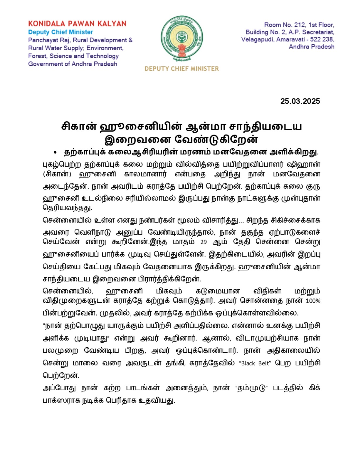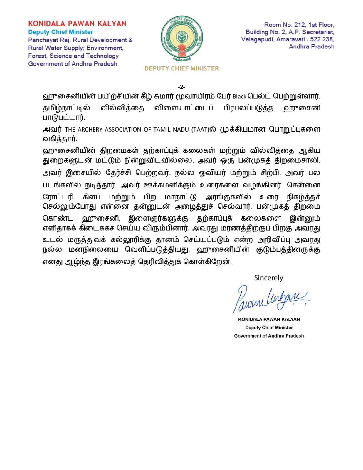 ஆந்திர மாநிலத்தின் துணை முதல்வரும், நடிகருமான பவன் கல்யாண் விடுத்துள்ள இரங்கல் செய்தியில் கூறியிருப்பதாவது..