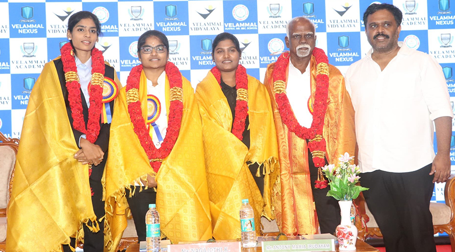 வேலம்மாள் நெக்ஸஸ் குழுமத்தின் Correspondent திரு.எம்.வி.எம்.வேல்மோகன், உலக கேரம் சாம்பியன்களான திருமதி.எம்.காசிமா, திருமதி.வி.மித்ரா, மற்றும் திருமதி.கே.நாகஜோதி ஆகியோரைப் பெருமையுடன் பாராட்டி ஊக்கப்படுத்தினார். உலக அரங்கில் சாதனைகள். இன்று நடைபெற்ற பாராட்டு விழா, கேரம் விளையாட்டில் சாம்பியன்களின் அர்ப்பணிப்பு, விடாமுயற்சி மற்றும் குறிப்பிடத்தக்க பங்களிப்புகளை எடுத்துக்காட்டுகிறது.
