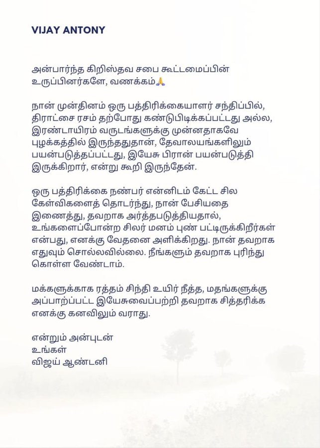 அதில், விஜய் ஆண்டனி தனது பேச்சுக்கு விளக்கம் அளித்துள்ளார்.