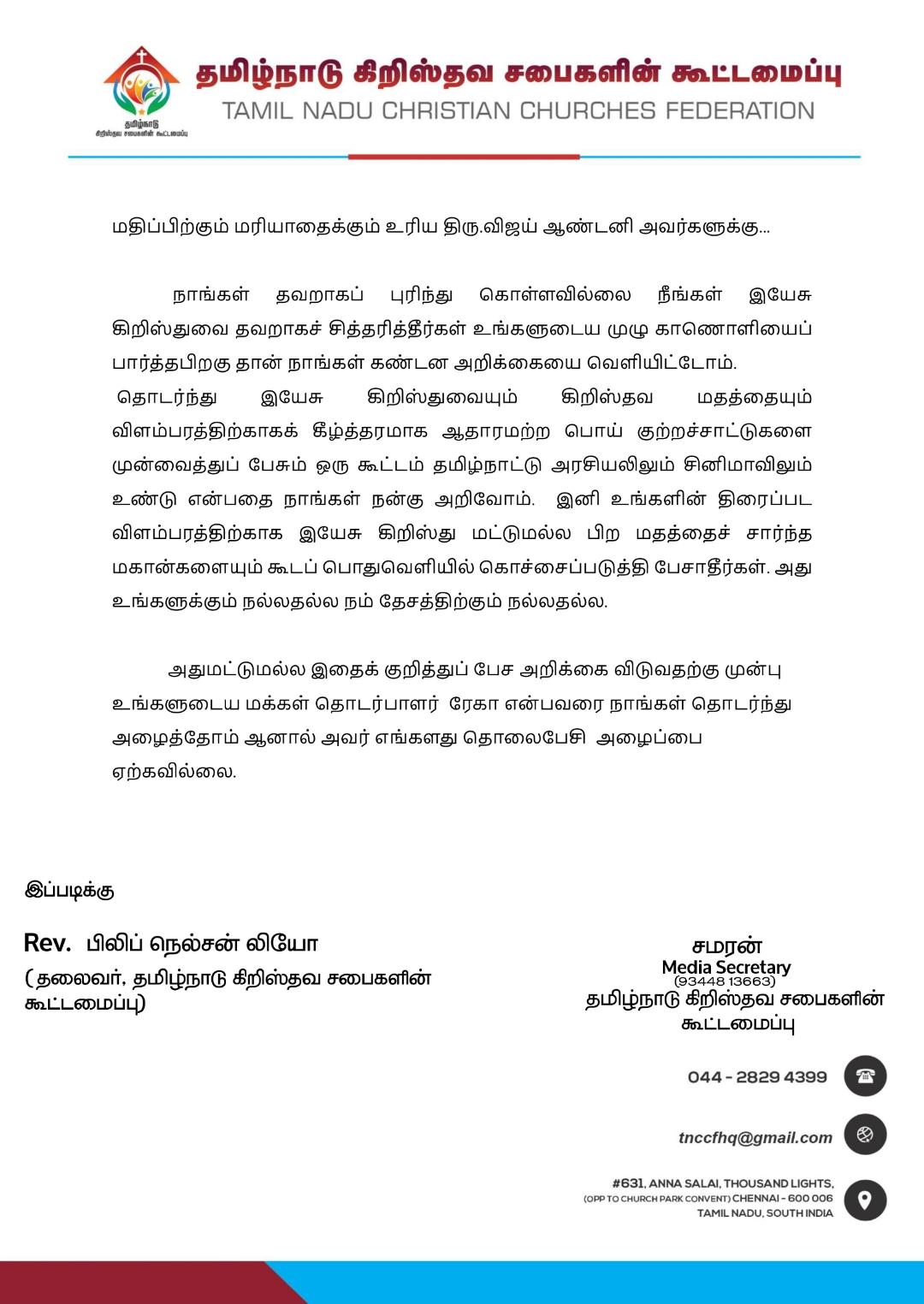 ‘அன்பார்ந்த கிறிஸ்தவ சபை கூட்டமைப்பின் உறுப்பினர்களே, வணக்கம்.. நான் முன் தினம் ஒரு பத்திரிகையாளர் சந்திப்பில், திராட்சை ரசம் தற்போது கண்டுபிடிக்கப்பட்டது இப்போது அல்ல. 2000 வருடங்களுக்கு முன்னதாகவே புழக்கத்தில் இருந்ததுதான், தேவாலயங்களிலும் பயன்படுத்தப்பட்டது, இயேசுபிரான் பயன்படுத்தி இருக்கிறார், என்று கூறியிருந்தேன்.